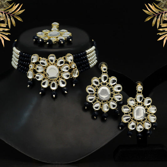 Black & White Color Choker Kundan Necklace Set (KN1194NBLU)